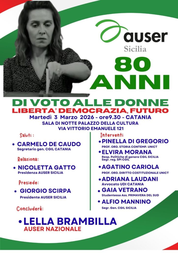 Si comunica che, nella ricorrenza dell’ottantesimo anniversario del voto alle donne (1946), martedì 3 marzo p.v. alle ore 9,30 presso la Sala di notte del Palazzo della Cultura in via Vittorio Emanuele n. 121 a Catania, le classi 3°AE, 3°CE e 4° CE, parteciperanno al convegno su Libertà, Democrazia e Futuro organizzato dall’Associazione Auser Sicilia.