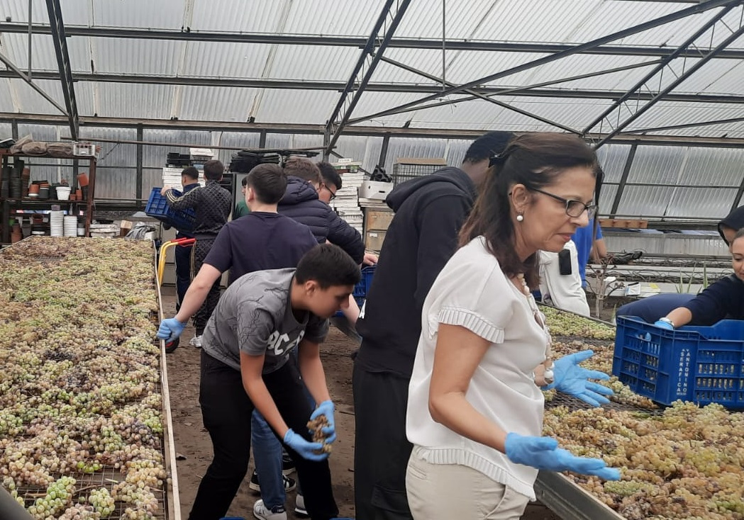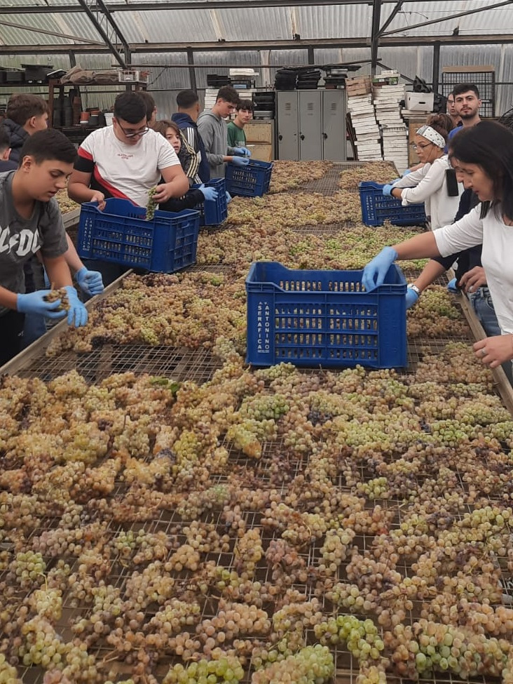 I nostri ragazzi a lavoro nella serra annessa al nostro istituto disponendo l’uva bianca su bancali con graticcio in piena fase produttiva di vino passito basato sull’appassimento delle uve con un processo di disidratazione che concentra zuccheri e aromi, a cui seguono le successive tecniche di vinificazione.